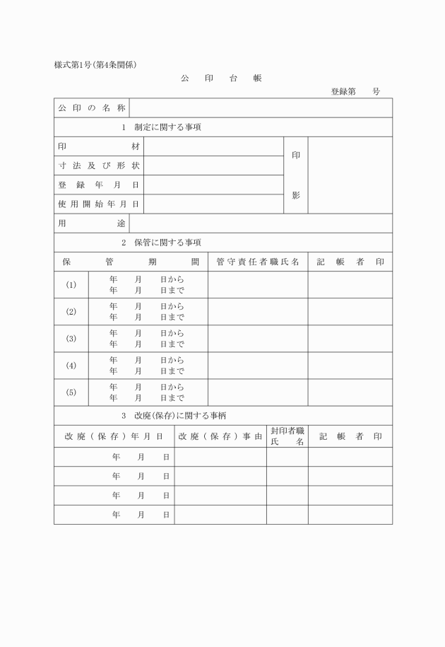 第7条 公印を新調し、改刻し、又は廃止しようとするときは、管守責任者においてその理由を記載し、教育長の決裁を受けなければならない。