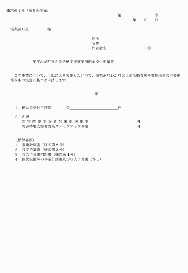 第6条 町社協がこの補助金の交付を受けようとするときは、わが町支え愛活動支援事業補助金交付申請書(様式第1号)に、次に掲げる書類を添えて、町長が別に定める日までに申請しなければならない。