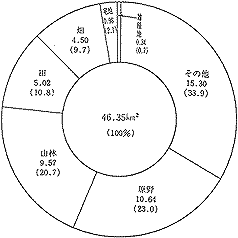 第1編 自然と地理 第1章 自然と環境 第1節 位置と面積 2 面積 本町の面積は46.35平方キロメートルで、県内39市町村中27番目、中部地区10市町村中6番目の広さである。なお、この中には(注)東郷湖の面積(4.17平方キロメートル)は含まれていない。地目別の面積は、図2に掲げたとおりである。 (注)従来、地元では「東郷池」と呼ばれてきたが、近年「東郷湖」と表記される事例も見受けられる。本町誌では東郷湖と記すのを原則としたが、一部で東郷池も併用した。