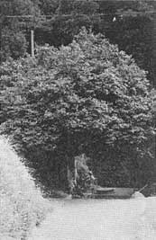 第1編 自然と地理 第1章 自然と環境 第6節 植物 2 町指定天然記念物 官内・井戸のツバキ 伯者一ノ宮(宮内)の参道の井戸のそばに、ツバキがある。井戸は、参拝者が身を清め、のどを潤すのに利用されたが、このツバキも井戸と同様、古くから多くの人に親しまれ、大切にされてきたものであろう。目通りの直径50センチメートル、樹冠は南北10メートル、東西8.8メートルあり、樹齢は約200年と推定される。3月から4月にかけて真っ赤な花をつける。ヤブツバキが正しい名前である。