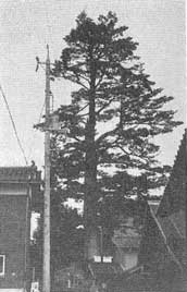 第1編 自然と地理 第1章 自然と環境 第6節 植物 2 町指定天然記念物 覚善寺のモミ 覚善寺(方地)の前庭にあるモミは、樹齢約250年と推定される。主幹の上部は2本に分かれ、そのうち1本は一部に腐朽が見られる。目通りの周囲4.1メートル、樹高40メートルの巨木で、天を突いて伸びた姿は、遠くからでもよく分かる。 次に挙げる2点は、かつての町指定文化財である。今はなくなっているが、記録しておきたい。