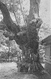 倭文理(宮内)の本殿裏にあったタブノキ(別名・ハネリ)は、神木としてあがめられていたが、昭和53年に腐朽のため倒れた。目通りの直径二・二メートル、枝張りは南北一〇メートル、東西八・八メートル、樹齢は六〇〇年と推定された古木であった。タブノキ特有の乳房状の突起物があったことから、「乳神さん」と呼び親しまれていた。幹が分岐した部分には、モチノキ・コナラ・リュウノヒゲ・ナナカマド・サクラ・ムラサキシキブなど14種もの草木類が寄生し、学習雑誌に紹介されるなど当時話題になった。