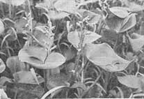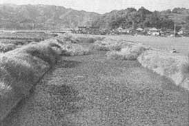 第1編 自然と地理 第1章 自然と環境 第6節 植物 3 東郷湖周辺の水生植物 河川の河口 舎人川の藤津橋周辺では、ヒシやウキクサが川面を埋めている。川岸近くの所々には、アブラガヤが見られる。川土手には、その花粉がゼンソクの原因になるといわれるブタクサも生育している。新門田橋から上流の前田橋まで約800メートルの間に、ヒシの大群落が見られる。九月に開花するオギやセイタカヨシは両岸に分布している。