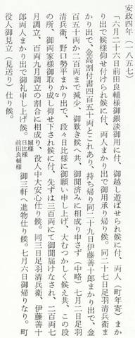 前田良輔は鳥取から銀談に出張してきた和田氏の家臣である。小鹿谷の陣屋に宿泊していたのであろう。最初は450両(注)の切り出しであった。和田邦之助はこの年4月に家老職を拝命しているから、家老職就任に伴う出費がかさんだためではなかろうか。領主からの銀談であるから、松崎町としては拒絶することはできなかったのであろうが、450両は過大であった。難しい交渉であったが、堀・日比両氏のとりなしがあり、結局300両で話がまとまり、町役人は大いに安心したというのである。