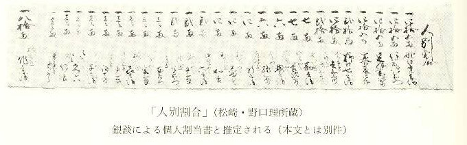 (注) 「金高割付書四百五十両」とあることから、この金額はあらかじめ和田家の側で、松崎の個々の町人の資力に応じて割り当ててあったとみられる。